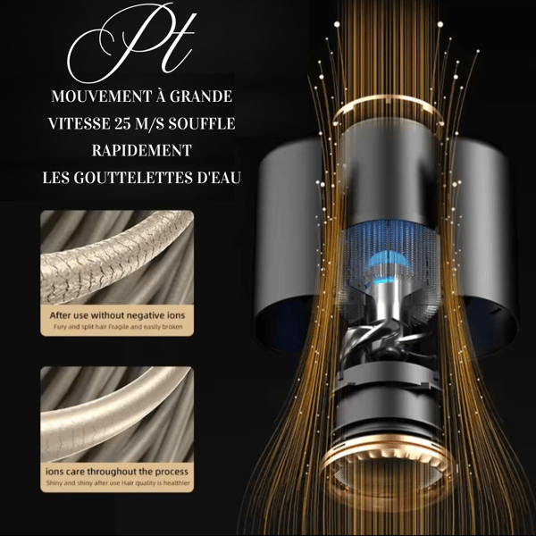 Sèche-cheveux 2400 W : Ce sèche-cheveux sèche vos cheveux rapidement et sans effort grâce à son puissant flux d'air. Le moteur de 60 000 tr/min génère un flux d'air de 25 m/s pour un séchage puissant qui sépare les cheveux mouillés jusqu'aux racines et déshydrate rapidement le cuir chevelu. Sèche les cheveux mi-longs en seulement 3 minutes.